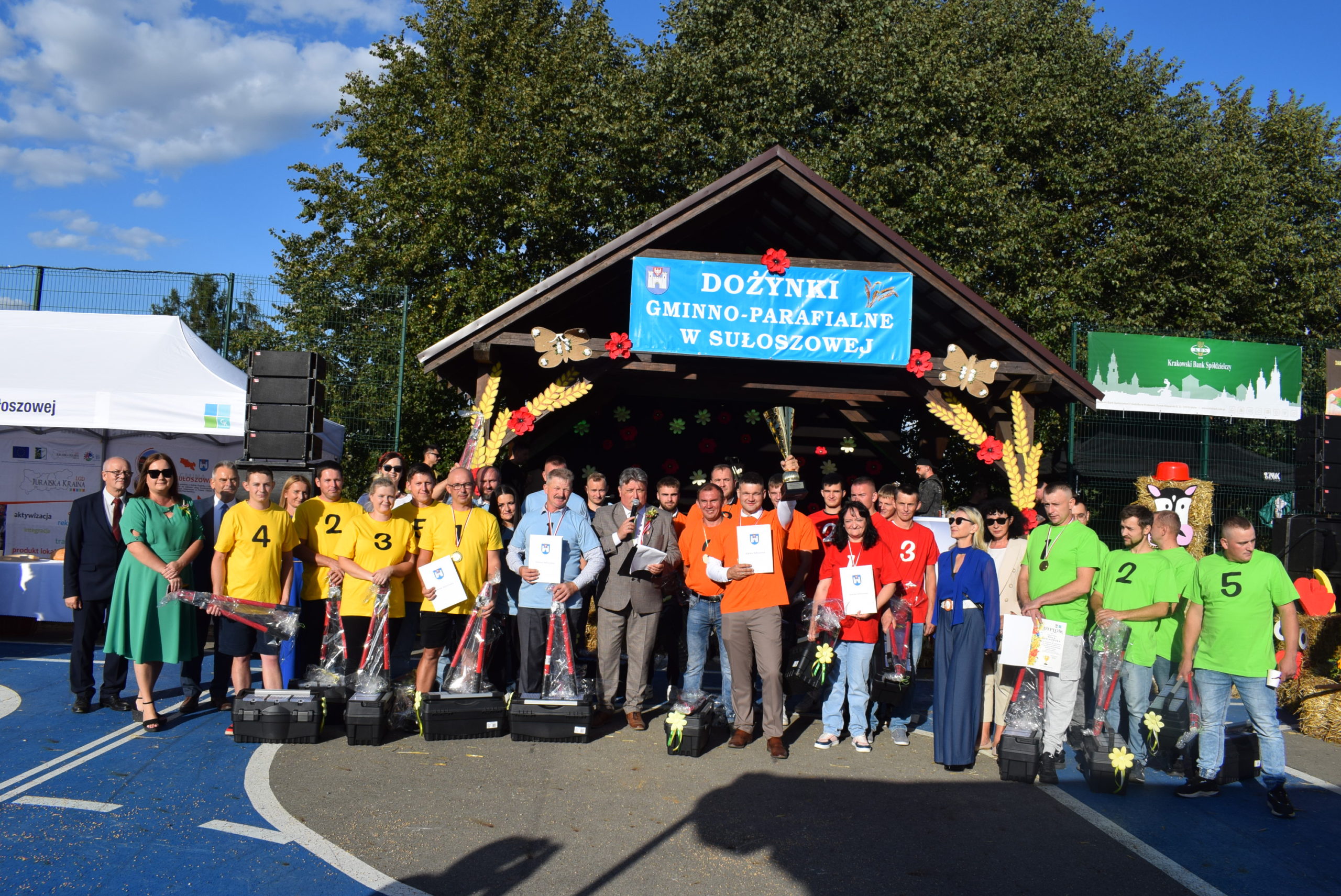 Turniej Sołectw obył się podczas dożynek. Do Turnieju zgłosiło się pięć sołectw z terenu naszej gminy, które po raz kolejny walczyły o zwycięstwo. Zawodnicy zmierzyli się w takich konkurencjach jak: Sypanie zboża, Woda na start, Szczęśliwy, kto znajdzie, Szejki oraz Kije. Nagrodami dla każdego uczestnika Turnieju Sołectw był duży, dwuręczny sekator oraz skrzynka na narzędzia. Turniej poprowadziła pani Agnieszka Gorajczyk wraz z Drużyną z Centrum Kultury w Sułoszowej. Pierwsze miejsce i Puchar zdobyło Sołectwo Sułoszowa III, drugie miejsce Sołectwo Sułoszowa I. Kolejne miejsce na podium egzekwo – Sułoszowa II oraz Sołectwo Wola Kalinowska. Miejsce czwarte zdobyło Sołectwo Wielmoża. Gratulujemy wygranym, dziękujemy za wspólną zabawę.